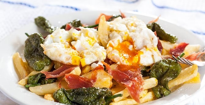 PLATO DE HUEVOS ROTOS CON JAMON SERRANO, PATATAS Y PIMIENTO